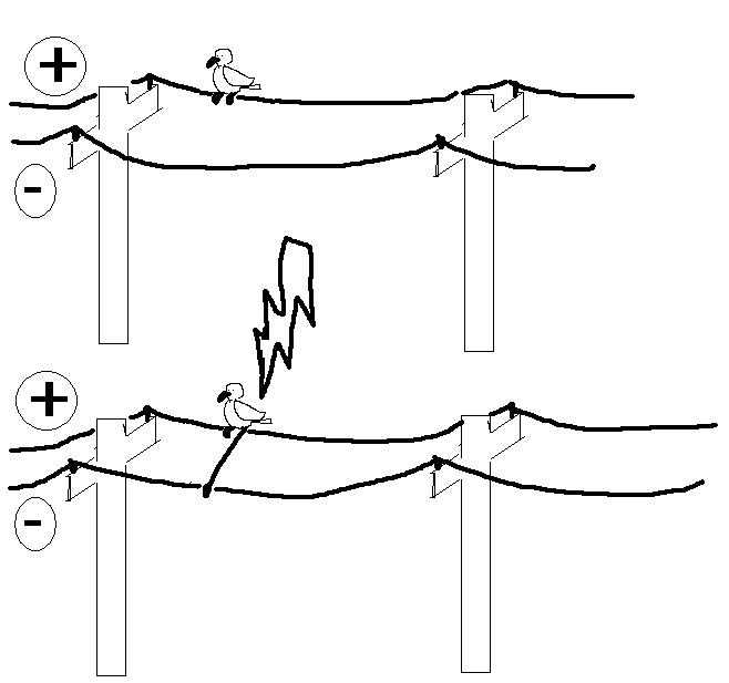 Tutto quanto detto si riferisce al caso in cui l’uomo (o l’uccello) siano poggiati solo ad uno dei fili dell’alta tensione (primo dei disegni seguenti). Se invece l’uomo (o l’uccello) è sospeso tra un cavo e l’altro (secondo dei disegni seguenti) allora la corrente che lo attraversa diventa grandissima (e letale) perchè i due cavi paralleli, trasportando corrente in verso opposti, presentano tra loro una differenza di potenziale molto grande.