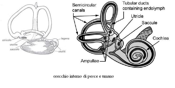 Mentre l’orecchio dei mammiferi è composto da orecchio esterno, medio ed interno, nei pesci è formato dal solo orecchio interno, come si vede dalla foto. Dato che  l’acqua ha una densità maggiore dell’aria, i suoni e le vibrazioni viaggiano cinque volte più velocemente che nell’aria, sono raccolti  più velocemente senza essere "concentrati" dall’orecchio esterno e trasmessi dalla catena degli ossicini dell’orecchio medio.