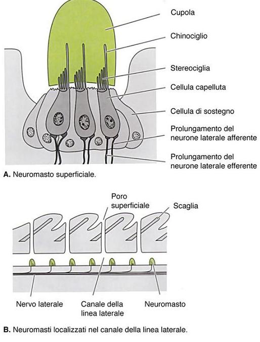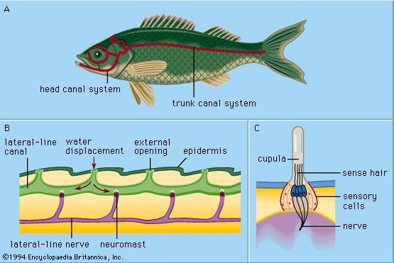 Lungo un canale che percorre l’intero corpo del pesce, si affacciano dei sensori, detti neuromasti, formati da cellule provviste di peli, che vengono stimolate dal passaggio  dell’acqua e che trasmettono le sensazioni tramite il nervo laterale.