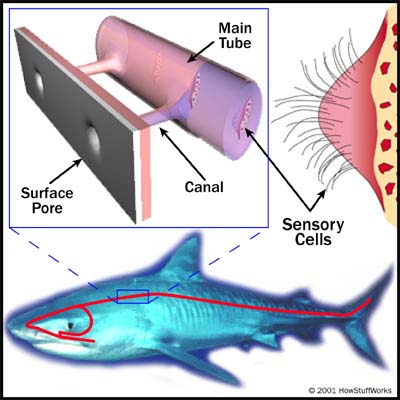 Una buona descrizione dell’orecchio degli squali e del loro funzionamento si trova in questo sito, da cui ho  tratto l’immagine seguente : http://edesabata.wordpress.com/2007/07/02/orecchio-di-squalo/
