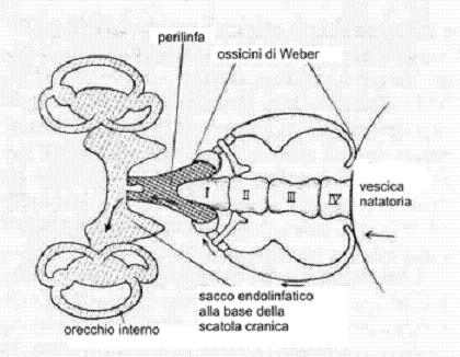 In alcune specie di pesci esiste una catena di ossicini, detta apparato Weberiano, che funziona trasmettendo i segnali acustici dalla vescica natatoria alla struttura del labirinto, funzionando come amplificatore di onde sonore.